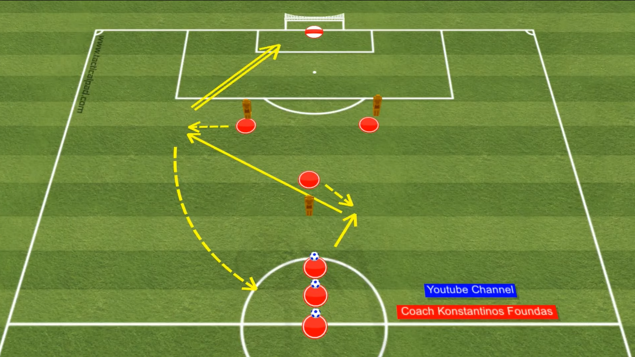 The attacking players must time their runs and finish the crosses into the goal. This drill improves players’ positioning, timing, and finishing skills in a realistic game scenario.