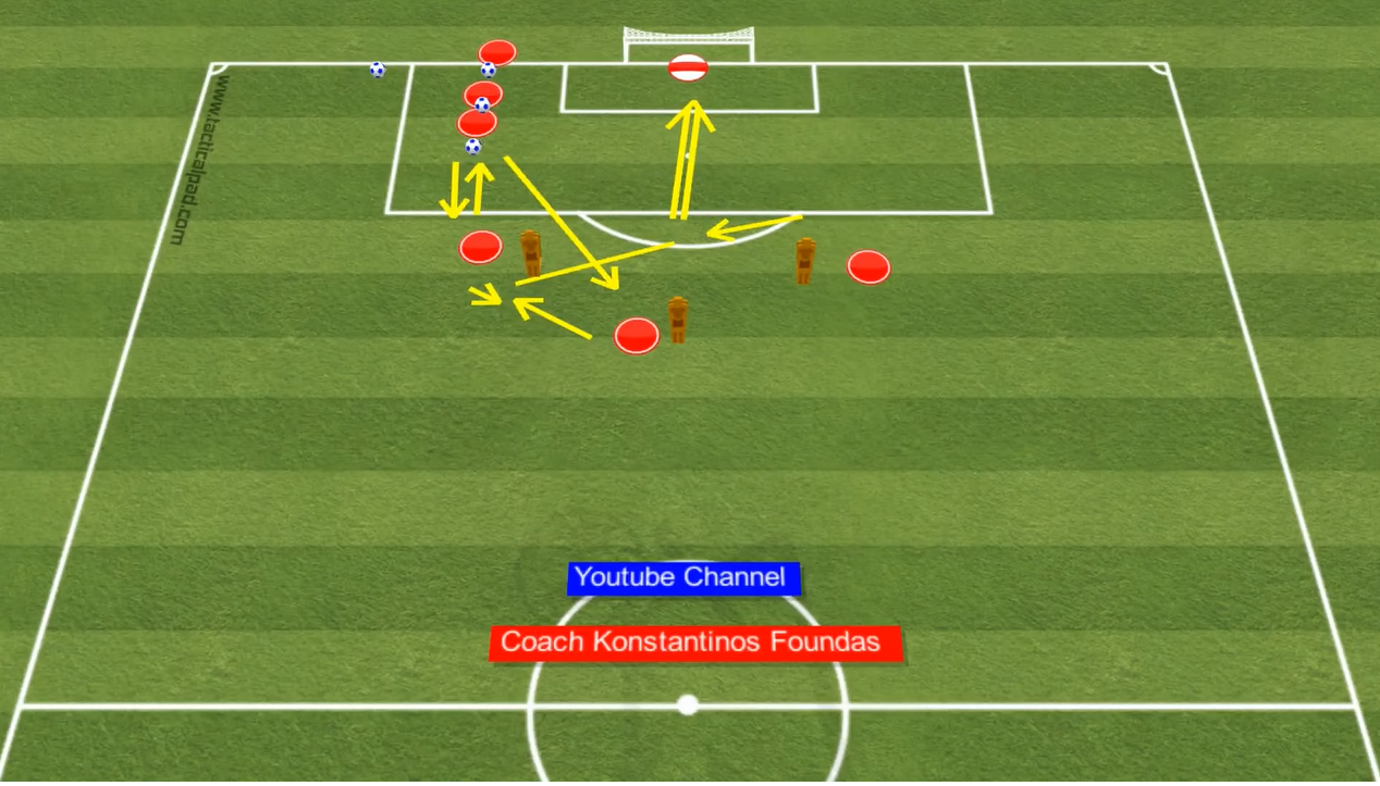 The attacking players must time their runs and finish the crosses into the goal. This drill improves players’ positioning, timing, and finishing skills in a realistic game scenario.