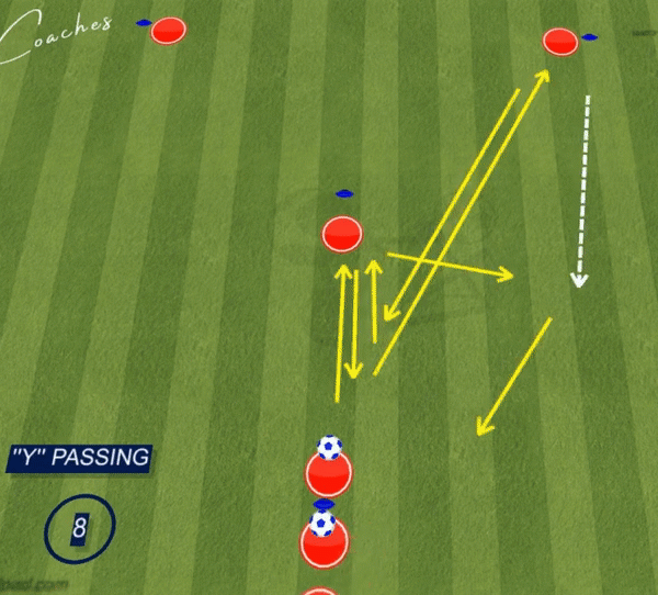 In this variation, players start at the base of the Y and pass the ball to the top. The receiving player then makes an overlapping run around the cone and receives a return pass. This drill helps players develop their timing, coordination, and understanding of overlapping runs, which are essential in creating attacking opportunities.
